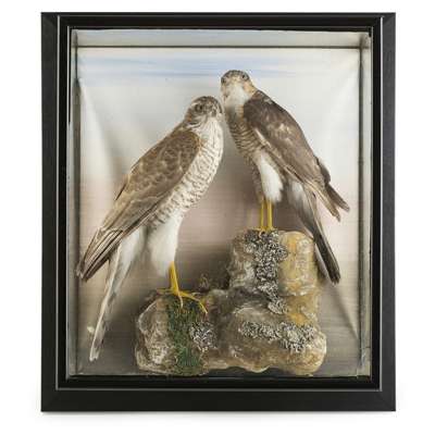 on a tree stump with greenery and pinecones, in a glazed wood case, 48.5cm wide, 71.5cm high; together with a CASED PAIR OF TAXIDERMY SPARROW HAWKS, on rockwork against a painted backdrop, in a wall mounted glazed ebonised case 44.5cm wide, 49.5cm high (2)