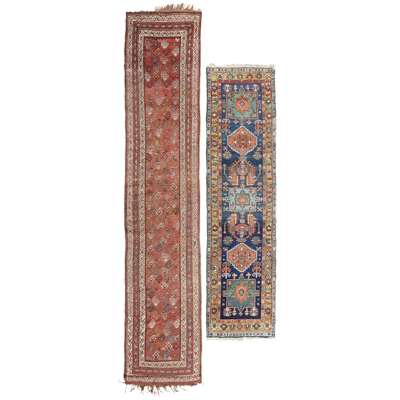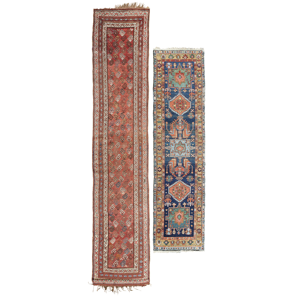 one with red field with allover boteh pattern, within triple ivory and red stylised vine borders; the other with indigo field with seven polychrome shaped medallions, within camel stylised foliate border (2)