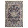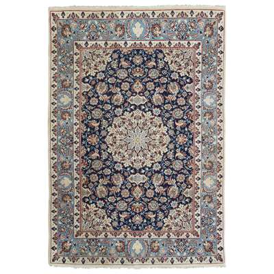 the indigo field with cream medallion, similar spandrels, within light blue palmette and vine border