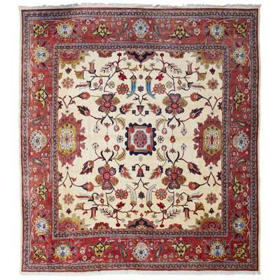 of Northwest Persian style, the cream field with small blue medallion and bold foliate pattern, within rust palmette and vine border