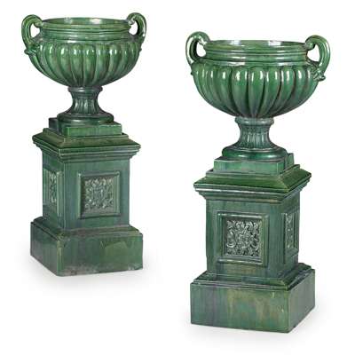 PAIR OF GLAZED FIRECLAY URNS AND STANDS