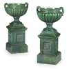 of low campana form with lobed bodies and loop handles, the square pedestal bases moulded with foliate panels (2)