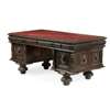 the rectangular top with a foliate carved edge and red leather insert, over a gadrooned frieze with three short drawers and dummy drawers opposing, raised on pedestal ends carved with lion masks and marked on the corners with columns, on large carved bun feet