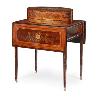 GEORGE III PAINTED SATINWOOD, ROSEWOOD, MAHOGANY HARLEQUIN PEMBROKE TABLE