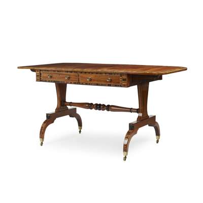LATE GEORGE III MAHOGANY AND SATINWOOD 'PATIENCE' TABLE