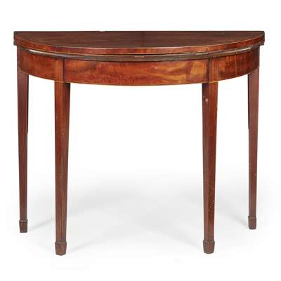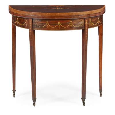 LATE GEORGE III MAHOGANY DEMI-LUNE AND INLAY CARD TABLE