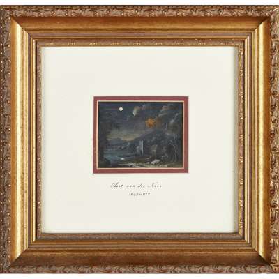 MOONLIT LANDSCAPE WITH A FISHERMAN BY BUILDINGS AND A LAKE
