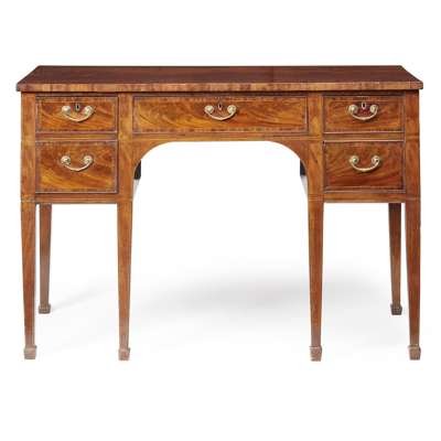 LATE GEORGE III MAHOGANY AND SATINWOOD CROSSBANDED BREAKFRONT SIDEBOARD
