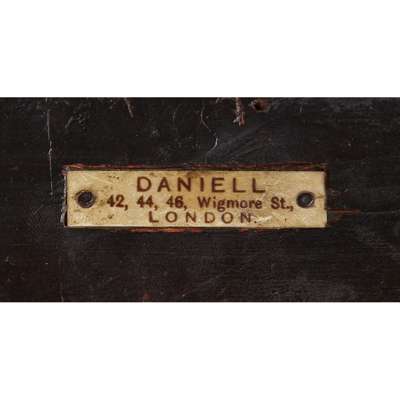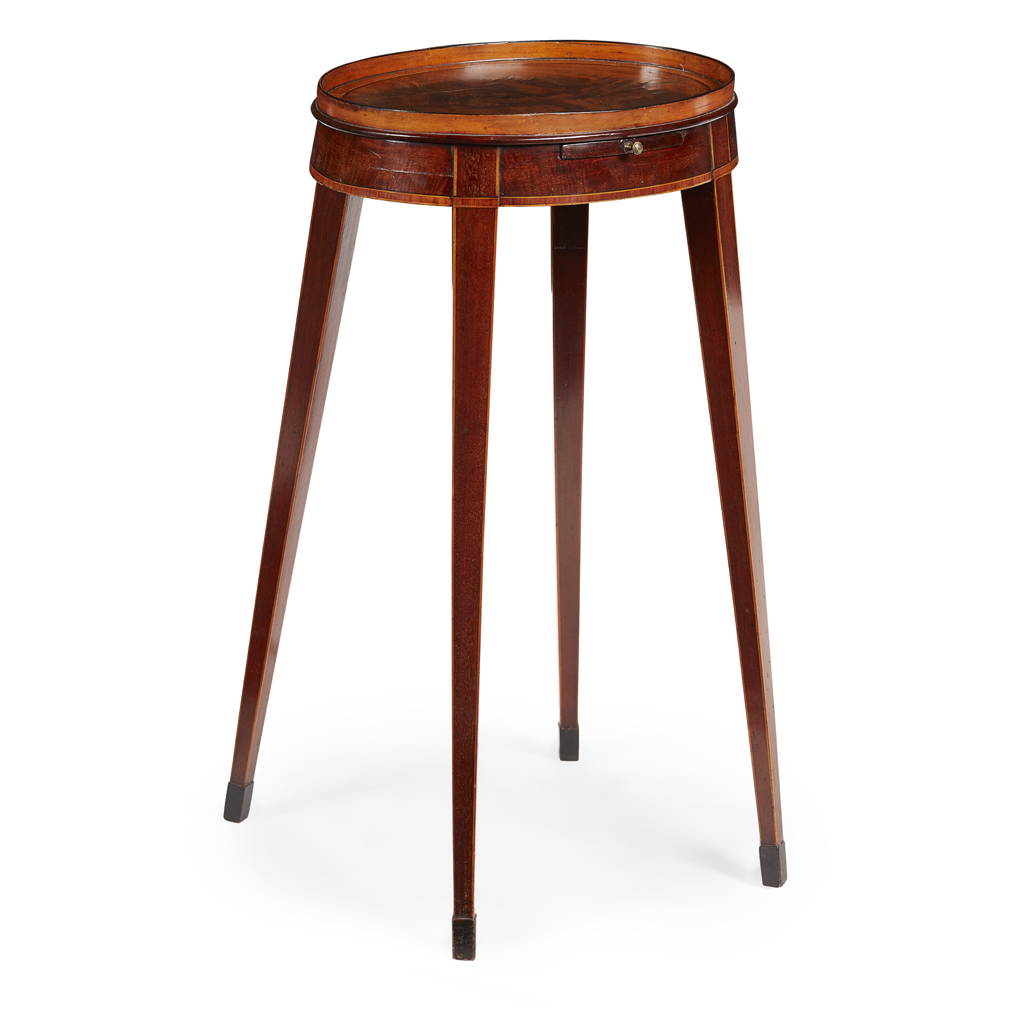 the oval crossbanded top with a gallery rail above a cup slide, raised on splayed square tapered legs ending in spade feet; bearing an old ivorine trade label 'DANIELL/ 42,44, 46, Wigmore St.,/ LONDON'