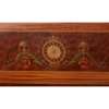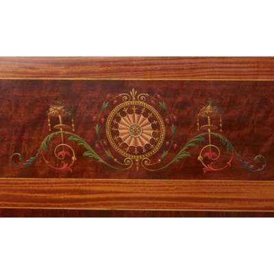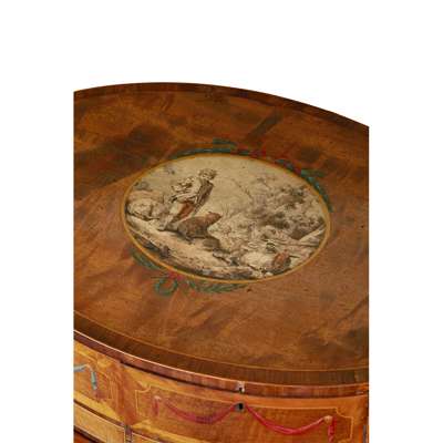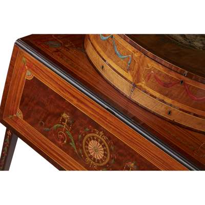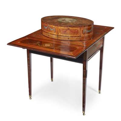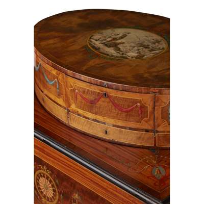 the rectangular banded top with drop down sides painted with classical motifs, the top centred with a spring released oval superstructure painted with a circular reserve depicting a shepherd boy and sheep, the sides fitted with drawers and pigeon holes, raised on slender square tapered legs painted with flower trails and ending in brass caps and castors