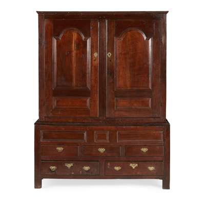 the moulded cornice above a pair of arched chamfered panel doors opening to a void interior; the base with an arrangement of five short drawers, raised on stile feet