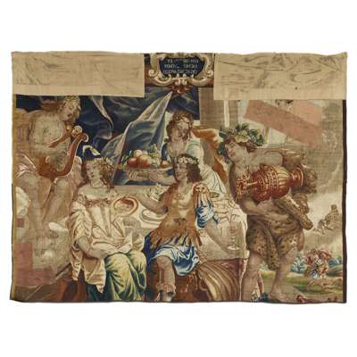 woven with Bacchus, Apollo, Ceres and attendants, with inscription cartouche to the top: 'CVM.CERERE.ET BACHO.IVVENEM DELECTAT.APOLLO'