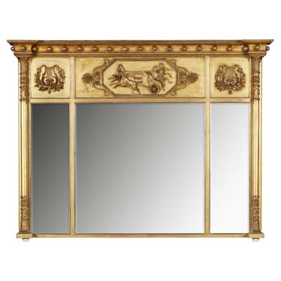 the inverted breakfront cornice with ball mounts above a frieze depicting Mars in a chariot drawn by a pair of horses, flanked by lyres and oak and laurel wreaths, over three bevelled mirror plates flanked by columns