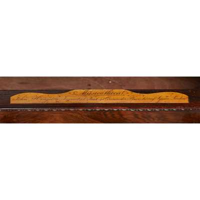 the hinged rectangular top with a bead moulded edge and ratchet adjustment above a frieze drawer with an inlaid trade label 'Muscathecal/ John Hingston, Invenit et Fecit 41 Cirencester Place, Fitzroy Square, London' and a divided open recess, the base with a further drawer, raised on bun feet