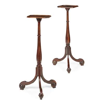 PAIR OF REGENCY MAHOGANY AND EBONY TORCHERES