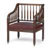 the reeded frame with a low back and downswept arms with baluster turned and reeded spindles, above a wide padded seat, raised on chamfered square legs ending in brass caps and castors