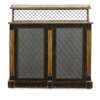 the pierced brass gallery and superstructure over a pair of doors with brass grille inserts flanked and divided by gilt fluted pilasters, on a plinth