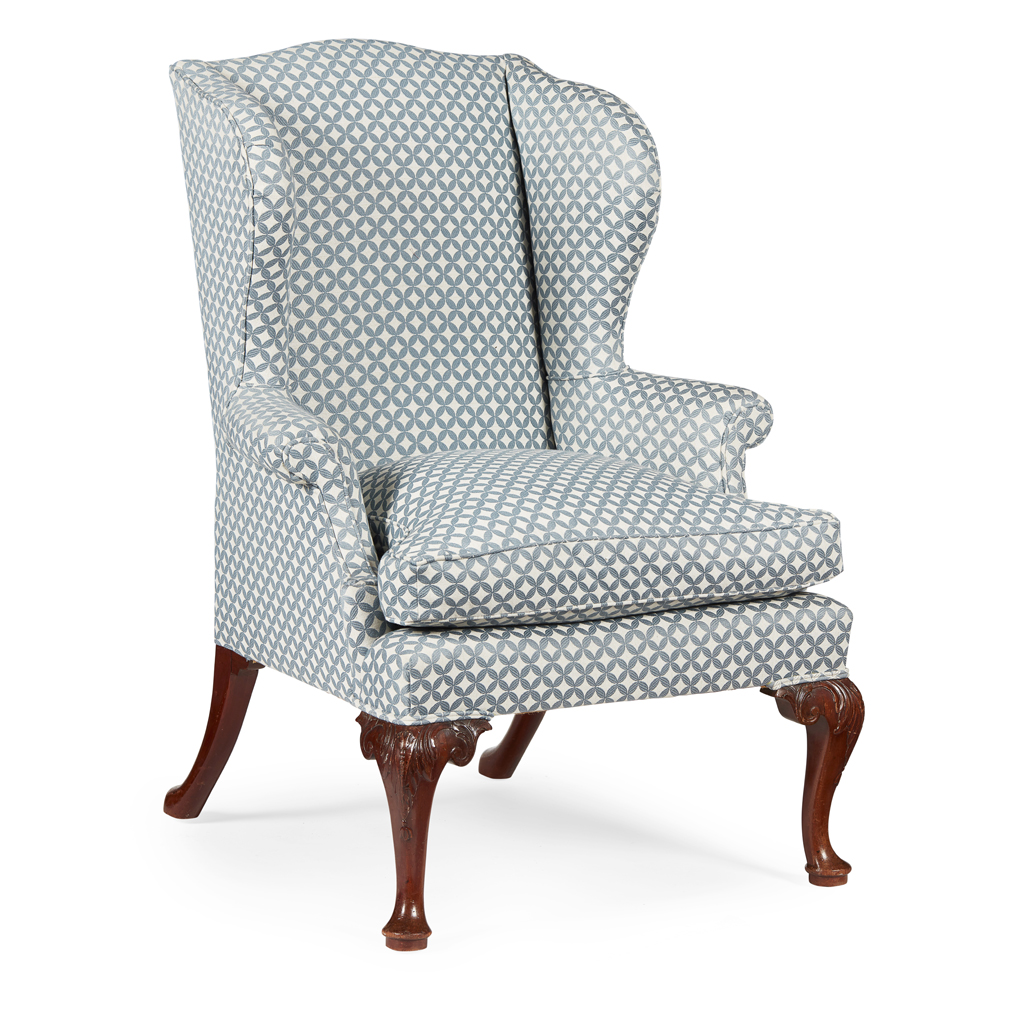 the tall padded back with a serpentine crest rail above a loose cushion seat and scroll arms, raised on acanthus carved cabriole legs ending in pad feet; in blue and white geometric pattern upholstery
