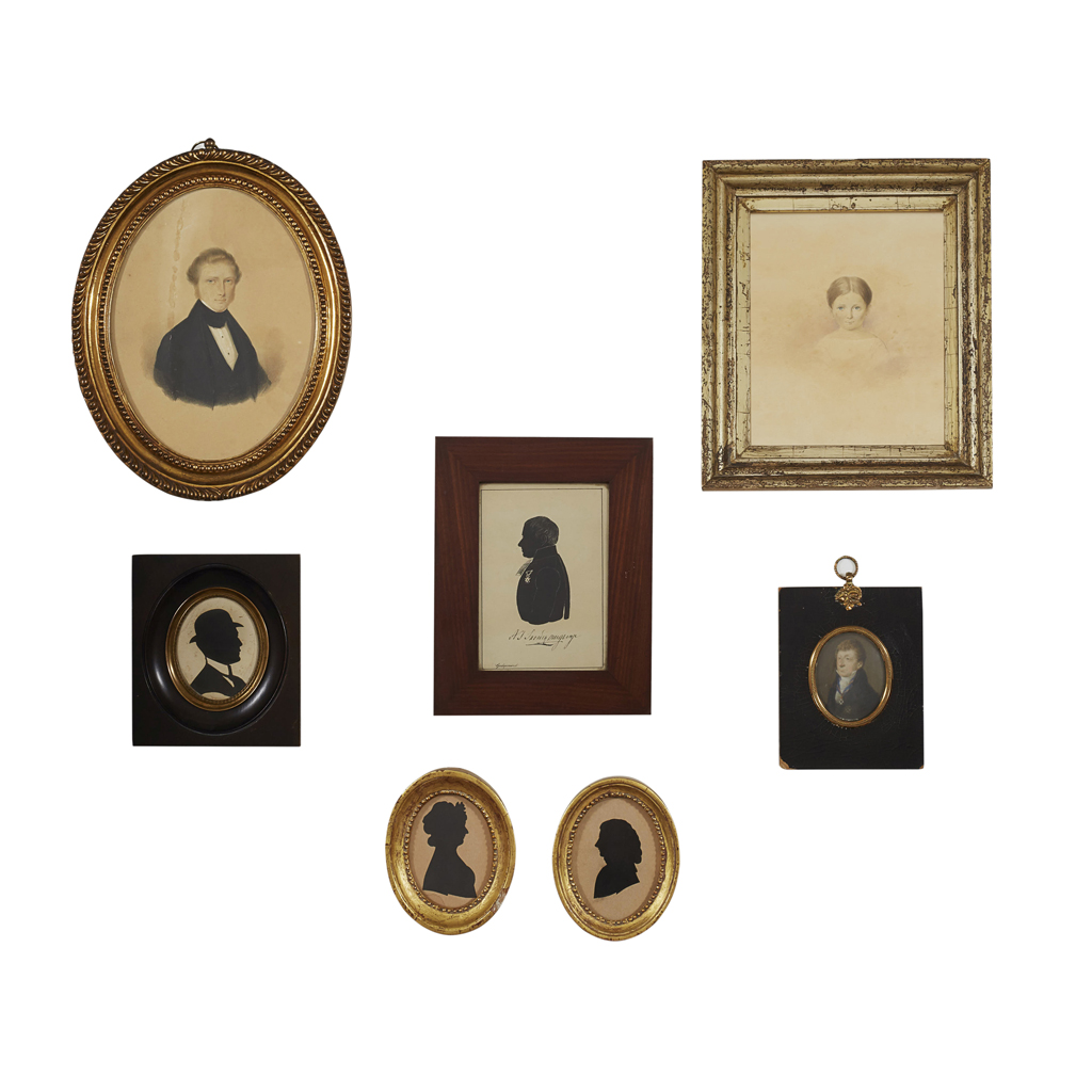 comprising a portrait of a Henriette Snouck Hurgronje as a child, pencil and watercolour on paper, signed C.K., 17.5 x 14cm; a portrait of William Adrian Snouck Hurgronje, pencil and watercolour on paper, 19.4 x 14.5cm; and three silhouettes, depicting various members of the Snouck family, 7.5 x 6cm and 7 x 6cm; all with handwritten notes to verso; together with a PORTAIT MINIATURE OF A GENTLEMAN, on ivory, 6 x 5cm, and a PRINTED SILHOUETTE PORTRAIT OF A GENTLEMAN, 13.5 x 9.5cm (7)