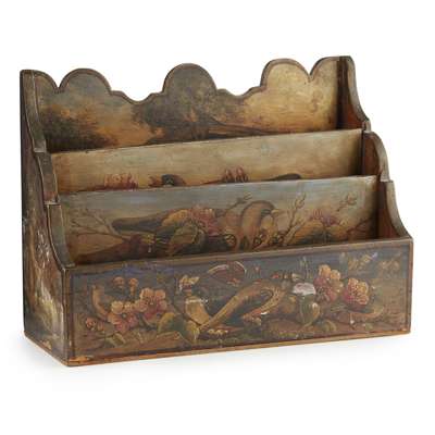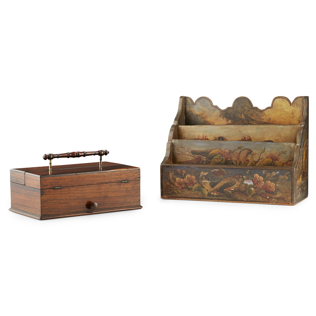 with a turned handle and doubled hinged lid, opening to a fitted interior with two glass inkwells above a single drawer, paper labels for Kerteux Antiguedades, 26cm wide; together with a PAINTED STATIONERY RACK, with a shaped back over three divisions, decorated with birds and foliage, 32.5cm wide, 24cm high (2)