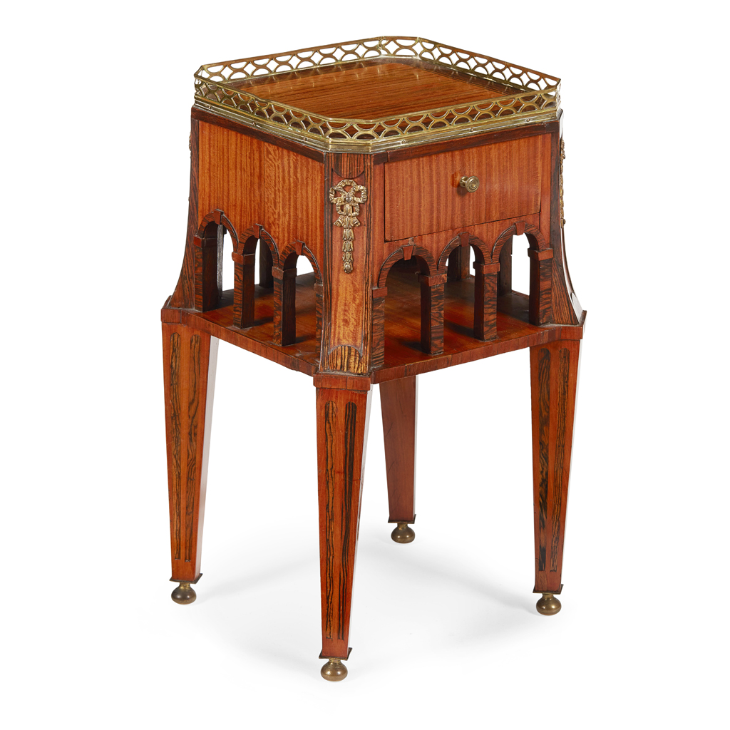 of neat size, the square top with a pierced brass gallery above a single frieze drawer over an arched architectural arcade and undertier, raised on square tapered legs ending in brass ball feet