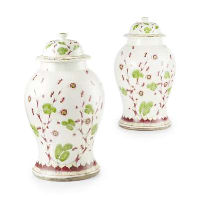with knop finials above domed covers and baluster bodies, decorated with prunus flowers on a white ground (2)