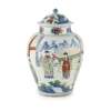 of squat baluster shape with a domed cover with pointed finial, decorated with boys and court figures on a terrace, unmarked