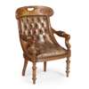 the acanthus carved curved crest rail centred by a cut out hand-hold, above a wide seat and part padded open arms, in button-upholstered brown leather, raised on turned and tapered legs