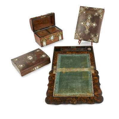 each with ivorine and brass mounts fitted with bosses, comprising a walnut tea caddy, with two lidded compartments, 23cm wide; a walnut card box, with later cards, 23cm wide; a walnut blotter, 29.5cm long; and a writing slope, with simulated grain, with a glass inkwell and velvet slope, 33.5cm wide (4)