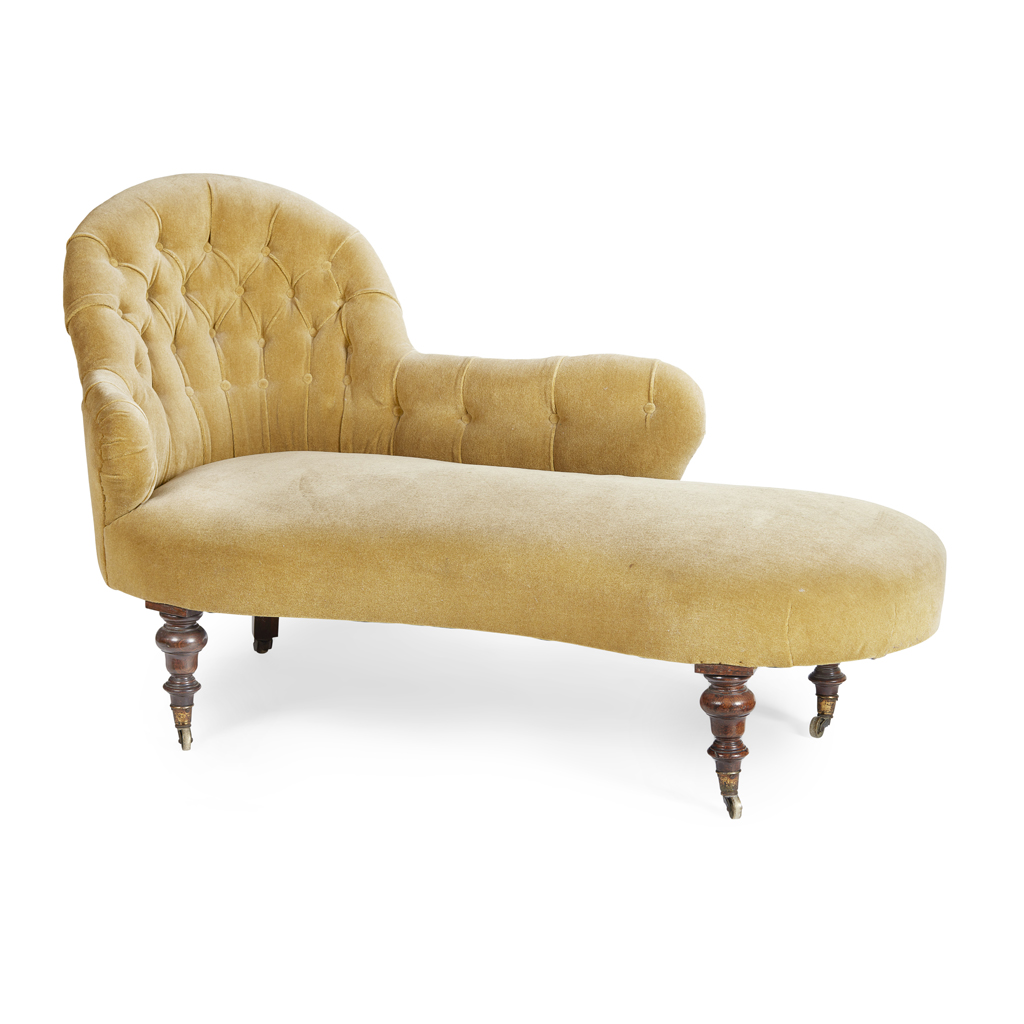 with a button upholstered back and curved arms, over a long serpentine padded seat, raised on rosewood turned legs ending in brass castors, in yellow-gold plush upholstery