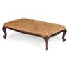 the padded rectangular cushion seat above foliate carved serpentine frieze on foliate carved cabriole legs; in gold and salmon pink patterned upholstery