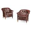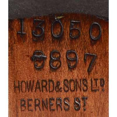 the low backs and curved enclosed arms in button-upholstered brown leather with nail head trim, above loose cushion seats, the rear legs stamped 'HOWARD & SONS LTD/ BERNERS ST' with serial no 12667/9010 and 13050/9897; the brass castors stamped 'HOWARD & SONS/ LONDON' (2)