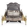 the double arch moulded backplate with trophy above a grate flanked by steel urn finials over a serpentine fret flanked by brass wings with tapered legs on ball feet and surmounted by urn finials