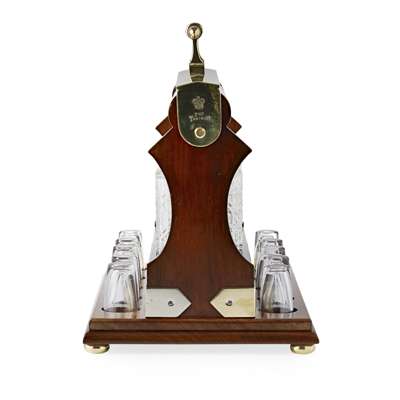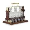 the brass handle marked THE TANTALUS and BETJEMANN'S/ PATENT 58267/ LONDON, above three cut glass decanters and stoppers, raised on a base fitted with ten liqueur/shot glasses