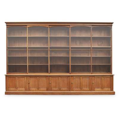the moulded straight cornice above four glazed sliding doors enclosing shelves; the base with four moulded panel doors, on a plinth base