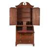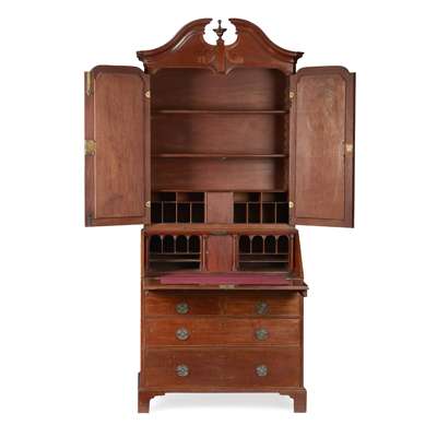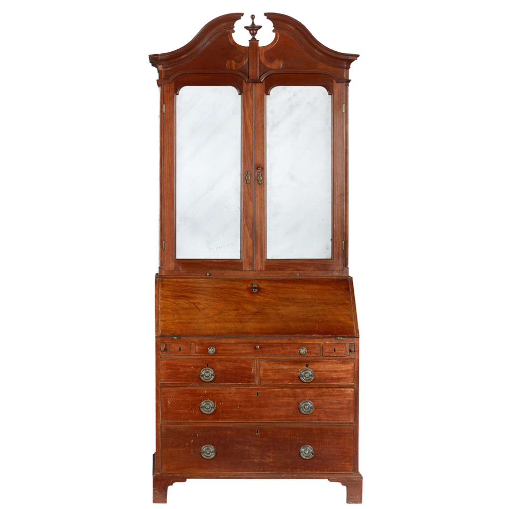 the broken swan neck pediment centred by an urn above a pair of arched mirror panel doors opening to a fitted interior; the base with a slant front enclosing an arrangement of pigeon holes and drawers, over three shallow drawers, a pair of short drawers, and two long graduated drawers, on later bracket feet