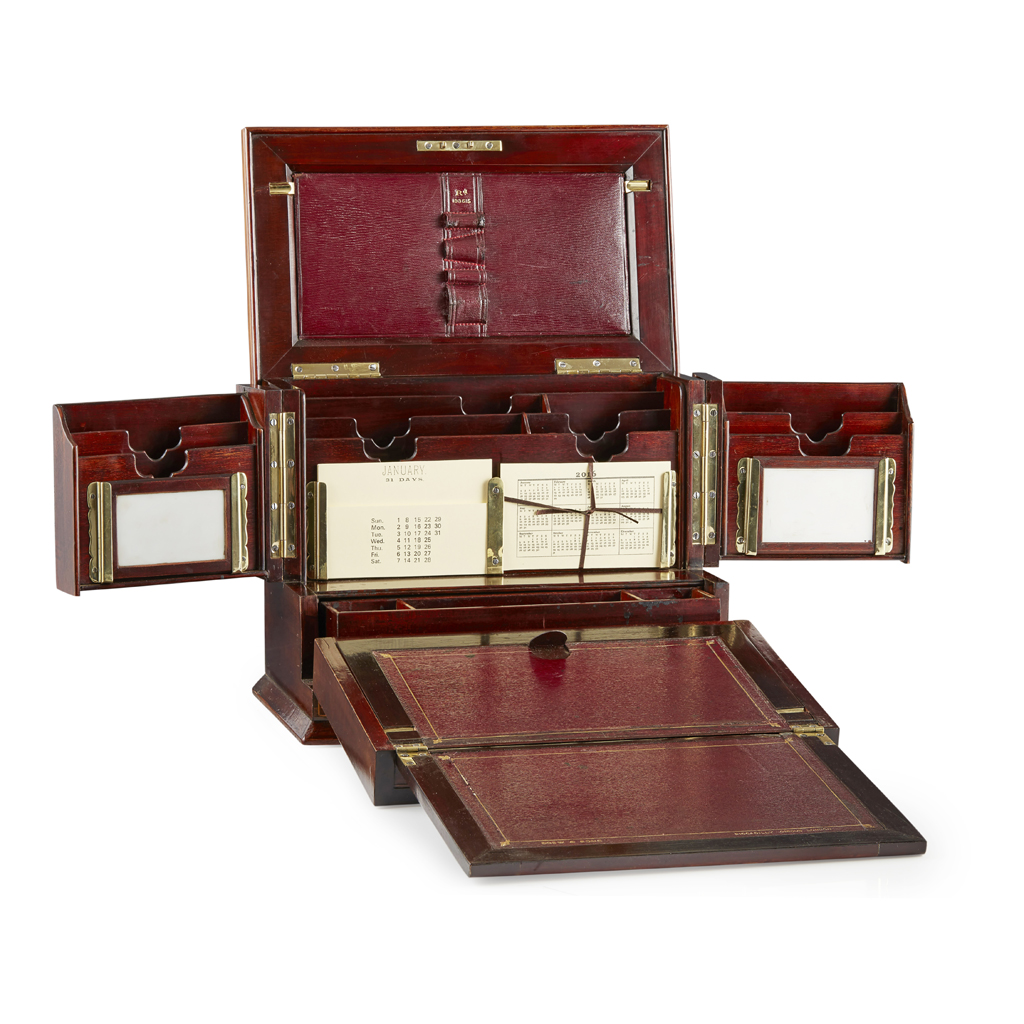 the fall front opening to reveal a leather-lined slope marked DREW & SONS/ PICCADILLY CIRCUS/ LONDON, below twin doors, letter and paper racks, a perpetual calendar and a sprung drawer fitted with two glass inkwells