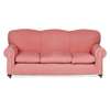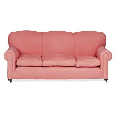 the triple hump back above a loose cushion seat and scroll arms, in a pale rose-coloured upholstery