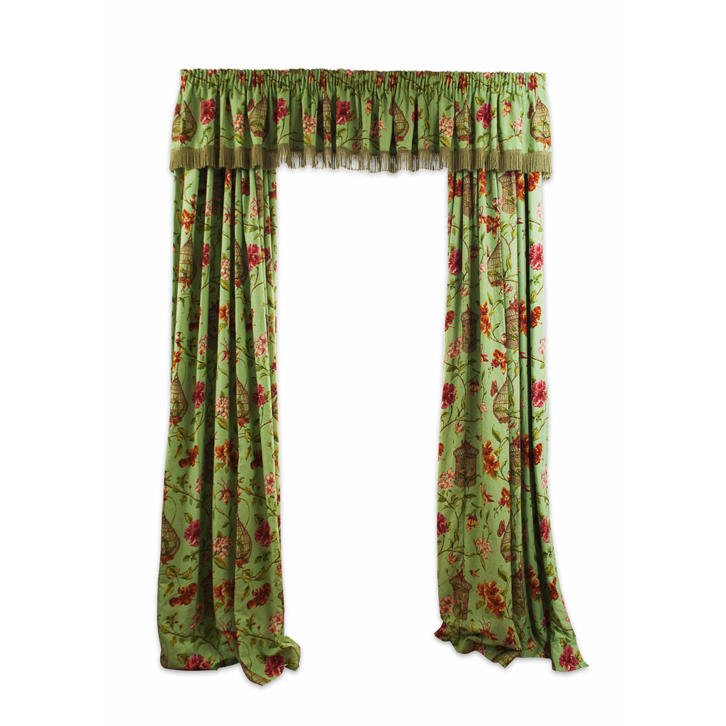 printed with orchids in baskets on a green ground, the matching pelmets with green fringe tassels (9)
