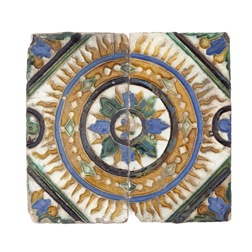 glazed in yellow/honey-brown, black, blue and green, variously lustred, depicting a repeating pattern over two tiles of floral motifs to each corner and sun rays enclosing a banded border and central stylised flower head, comprising twenty-seven tiles and one partial tile (28)