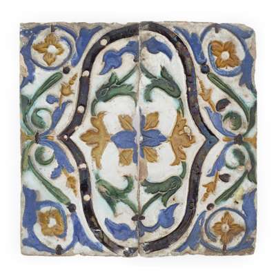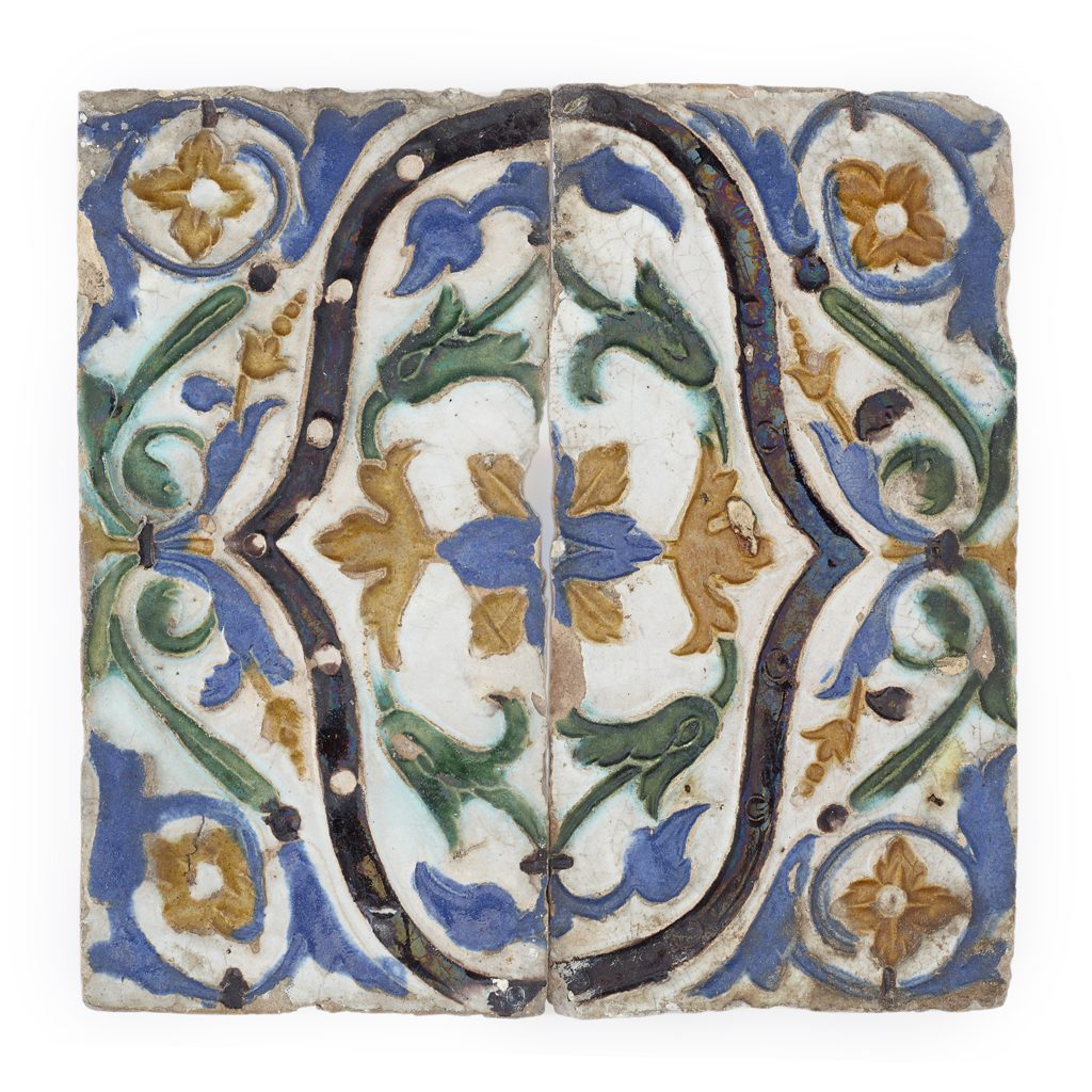 glazed in yellow/honey-brown, dark manganese-brown, blue and green, variously lustred, depicting a repeating pattern over two tiles with flower heads to each corner and serpentine borders enclosing stylised flower heads and leaves, comprising twenty-two tiles (one broken) and one partial tile (23)