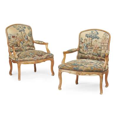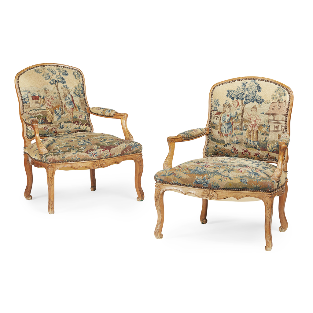 PAIR OF FRENCH BEECH AND NEEDLEWORK UPHOLSTERED ARMCHAIRS