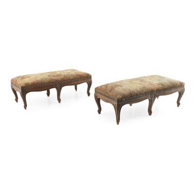 the rectangular padded tops with woolwork covers, raised on carved cabriole legs with scrolled toes (2)
