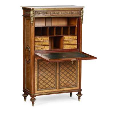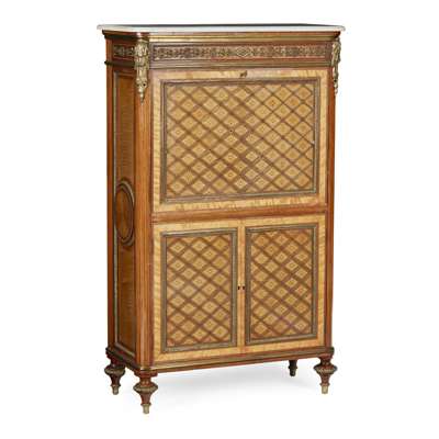 FINE LOUIS XVI STYLE MAHOGANY, SATINWOOD AND PARQUETRY SECRETAIRE À ABBATANT, IN THE MANNER OF JEAN HENRI RIESENER