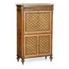 the white marble top with a moulded edge above a fall front opening to an interior fitted for writing, above a pair of cupboard doors, all with diaper pattern parquetry, with gilt metal mounts throughout, raised on toupie feet
