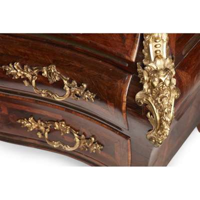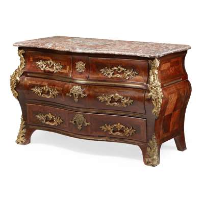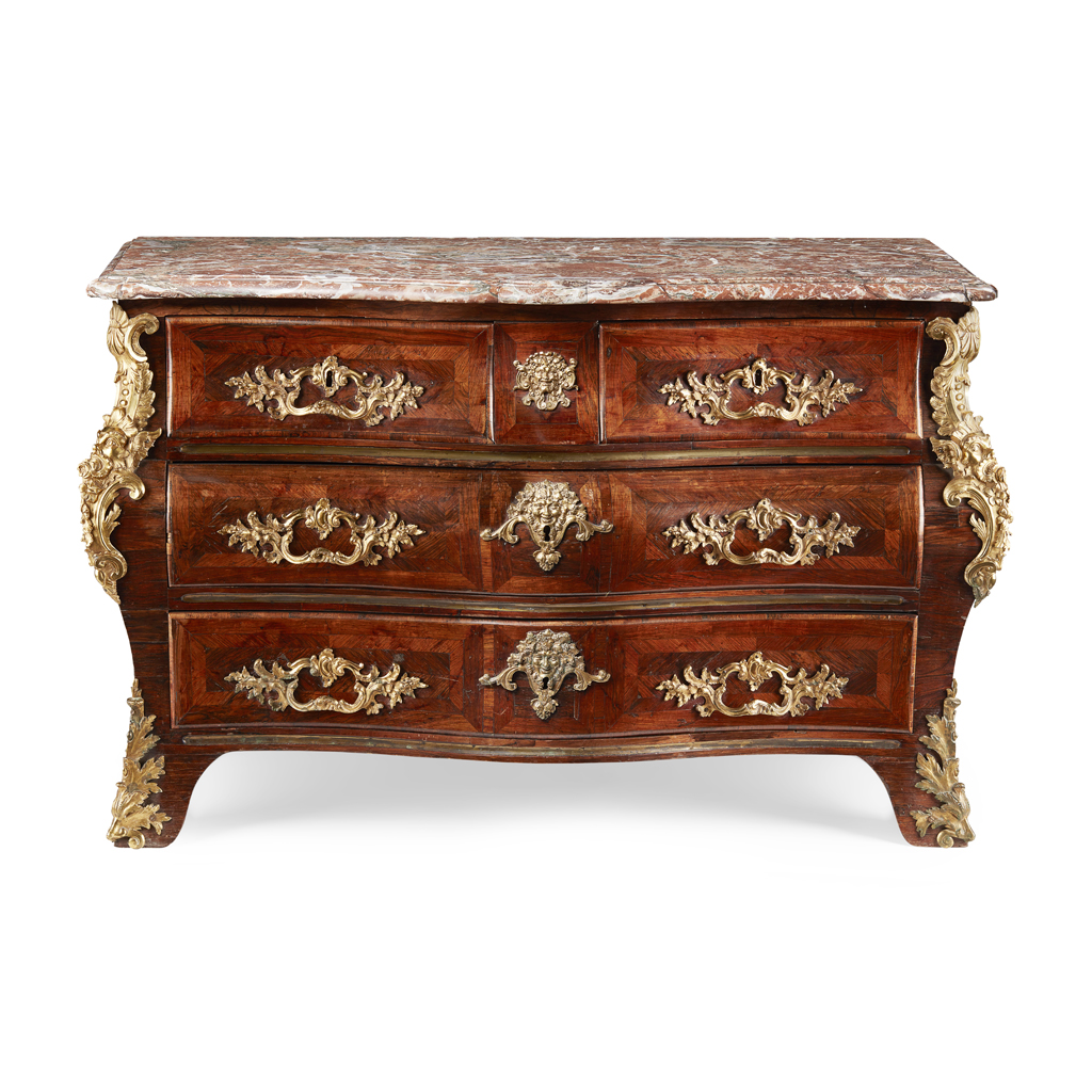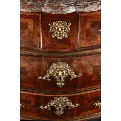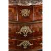 LOUIS XV KINGWOOD AND PARQUETRY MARBLE TOP SERPENTINE BOMBE COMMODE