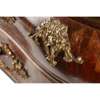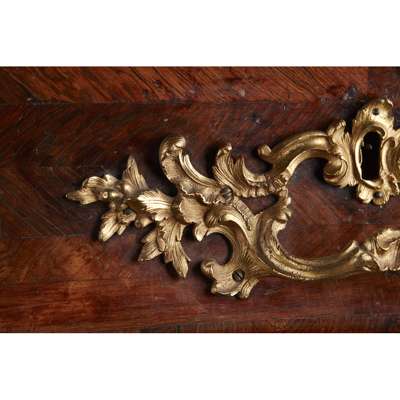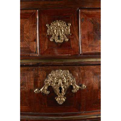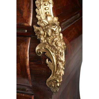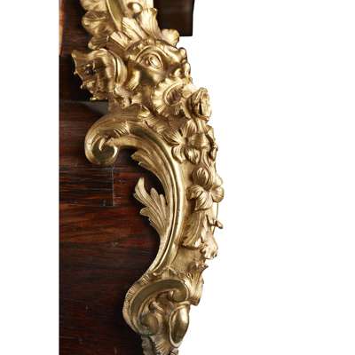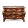the serpentine breche violette marble top with a moulded edge, above a pair of short drawers and a pair of long drawers with gilt bronze foliate cast loop handles and mask escutcheons, the forecorners and feet mounted with bold gilt bronze mounts