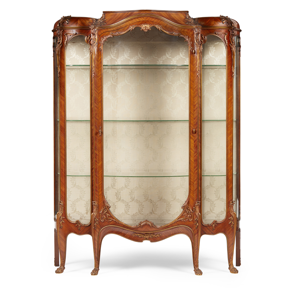 the shaped and moulded cornice above a serpentine arched and gazed door flanked by glazed side panels, outlined with rose and gilt bronze mounts, the interior with glass shelves and a cream fabric lined back panel, raised on cabriole legs ending in gilt bronze paw feet
