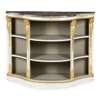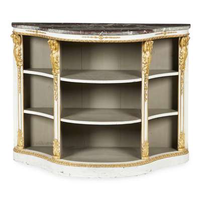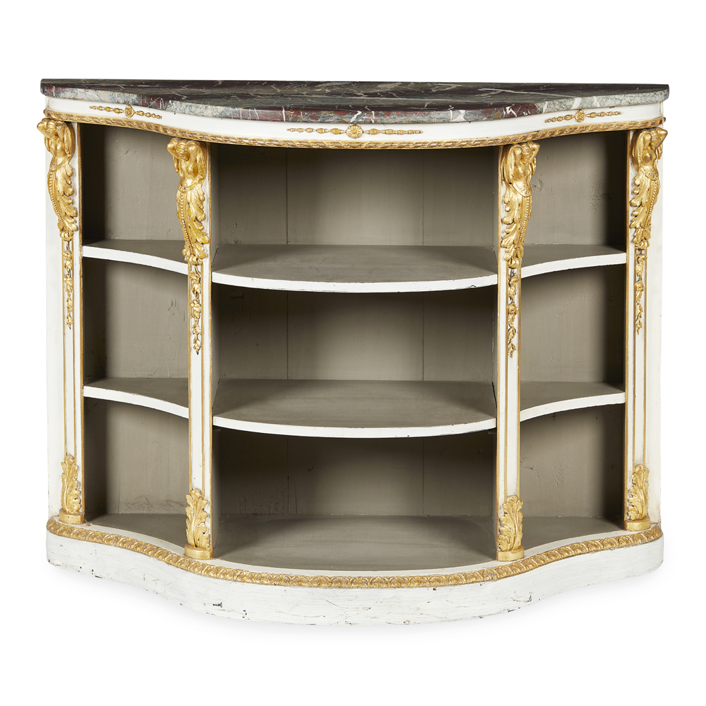 the serpentine purple veined marble top above grey painted open shelves flanked and divided by carved gilt female terms and acanthus, on a conforming plinth base