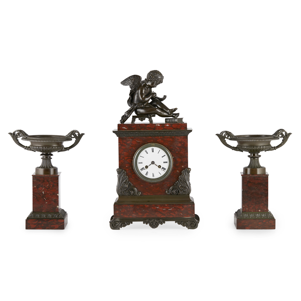 CHARLES X ROUGE MARBLE AND BRONZE CLOCK GARNITURE
